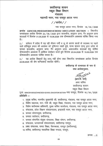 प्रदेश में लगातार बढ़ रही भीषण गर्मी और लू के प्रकोप को देखते हुए छत्तीसगढ़ शासन के स्कूल शिक्षा विभाग ने बड़ा निर्णय लेते हुए ग्रीष्मकालीन अवकाश की घोषणा कर दी है। जारी आदेश के अनुसार प्रदेश के सभी शासकीय, अनुदान प्राप्त एवं गैर अनुदान प्राप्त विद्यालयों में अब 20 अप्रैल 2026 से 15 जून 2026 तक ग्रीष्मकालीन अवकाश रहेगा।